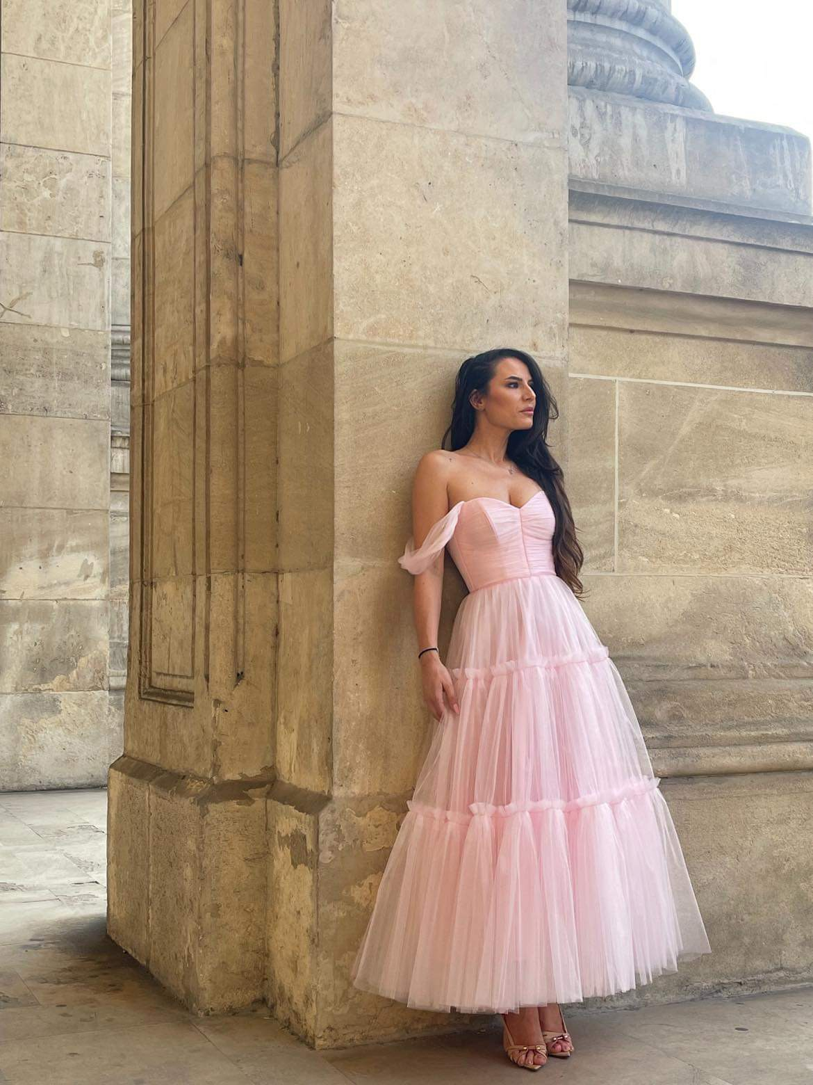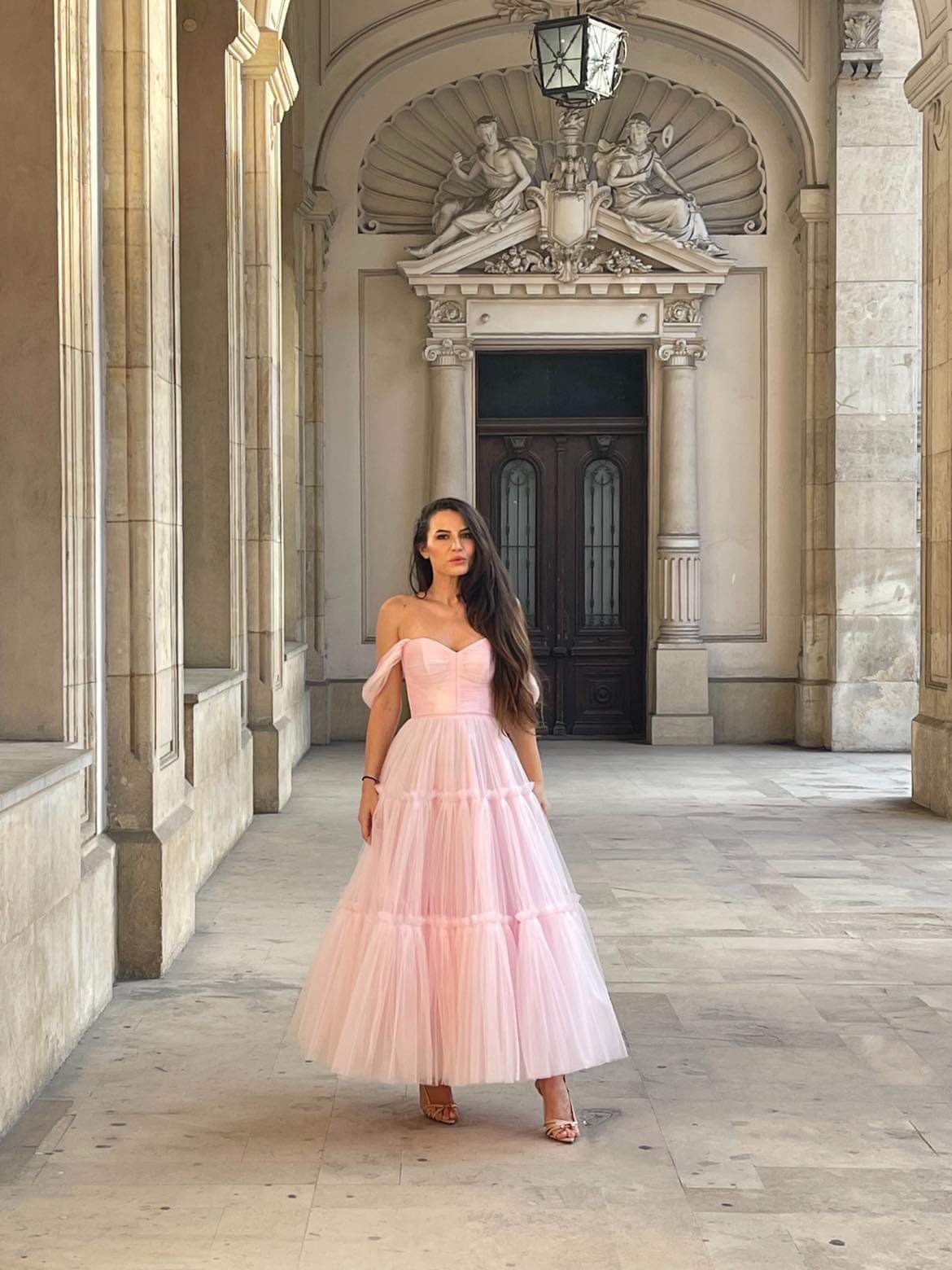 Această rochie midi, confecționată dintr-un tul fin și vaporos, este alegerea perfectă pentru a adăuga o notă de romantism și eleganță oricărui eveniment special. Designul său atemporal este evidențiat de bustul fronsat, tip corset, care conturează armonios silueta, oferind o alură feminină și rafinată. Bretelele delicate, căzute grațios pe umeri, adaugă un plus de subtilitate și senzualitate, scoțând în evidență linia gâtului și a umerilor.