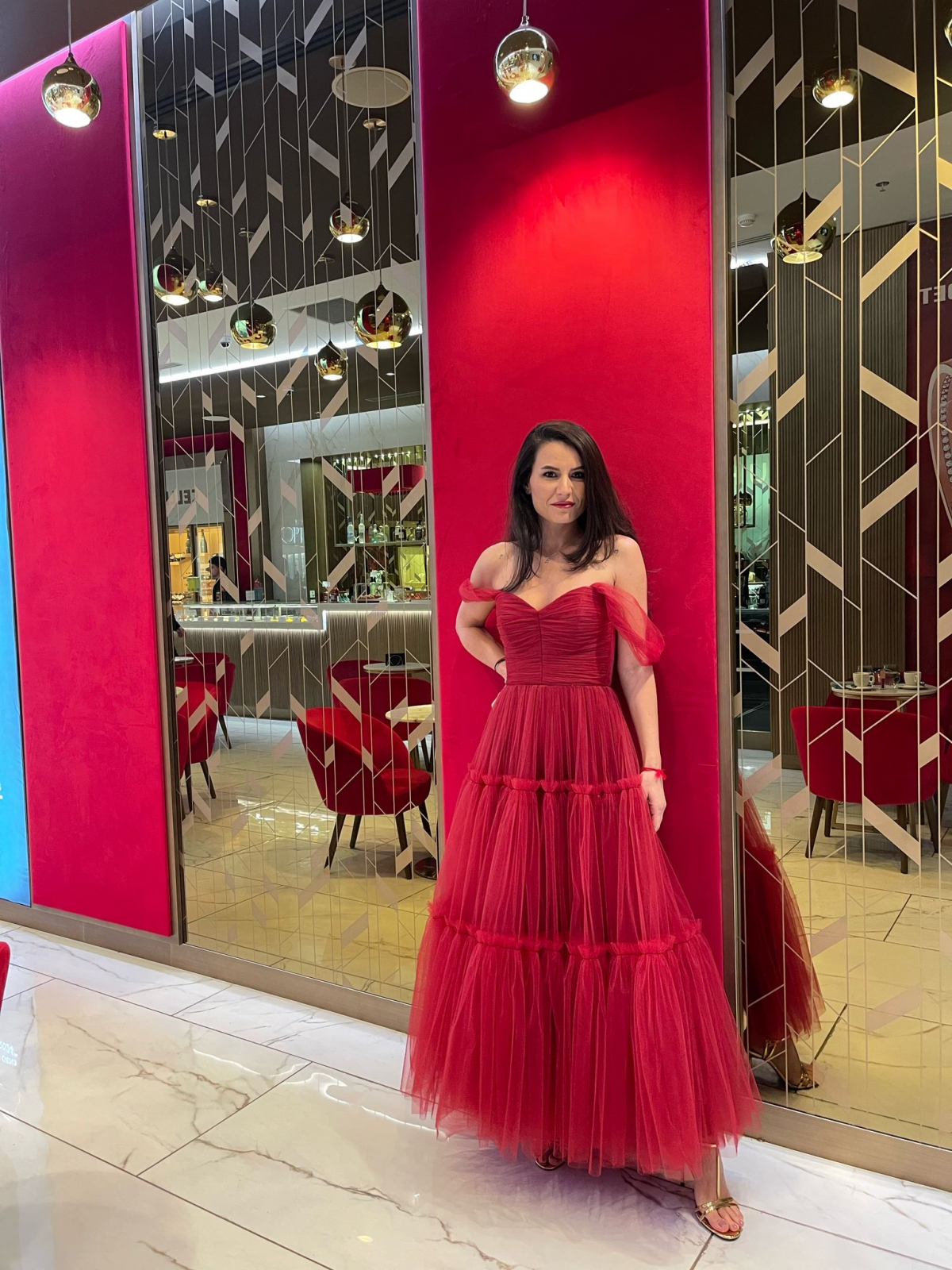 Fii gata să atragi toate privirile cu această rochie roșie midi superbă, confecționată dintr-un tul fin și vaporos. Nuanța vibrantă de roșu transformă această rochie într-o piesă vestimentară plină de personalitate, ideală pentru evenimentele unde dorești să lași o impresie puternică și memorabilă. Designul său atemporal este evidențiat de bustul fronsat, tip corset, care conturează armonios silueta, oferind o alură feminină și rafinată. Bretelele delicate, căzute grațios pe umeri, adaugă un plus de subtilitate și senzualitate, scoțând în evidență linia gâtului și a umerilor.